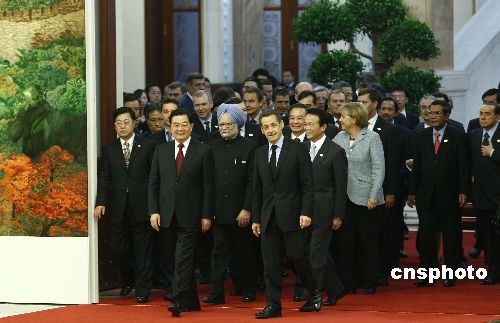 10月14日,第七屆亞歐首腦會議在北京人民大會堂開幕。中國國家主席胡錦濤、國務院總理溫家寶,與出席會議的各國領導人合影。中新社發 盛佳鵬 攝