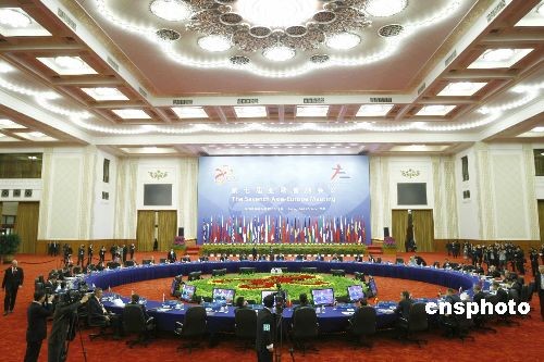 第七屆亞歐首腦會議在北京人民大會堂舉行第一次全體會議,議題是討論國際經濟金融形勢問題。中新社發 盛佳鵬 攝