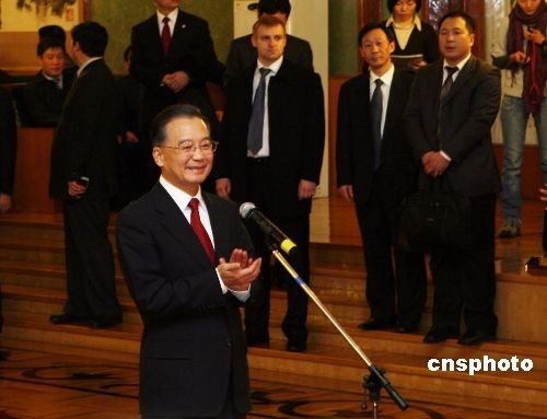 溫家寶當晚首先看望了中國駐俄羅斯使館工作人員和中資機構、華僑華人及留學生代表,并發表講話。中新社發 田冰 攝