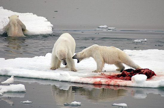 兩只北極熊在冰面上爭(zhēng)搶食物。