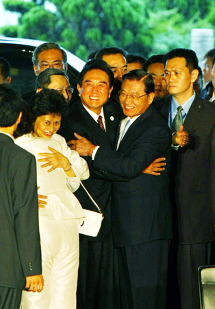 大陸海協(xié)會(huì)會(huì)長陳云林(右三)三日率協(xié)商代表團(tuán)來臺(tái),進(jìn)入臺(tái)北圓山飯店后,與;鶗(huì)董事長江丙坤(右二)熱情擁抱。