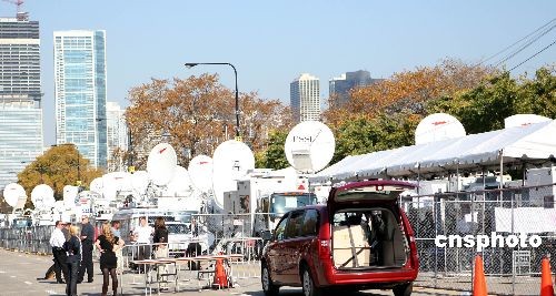 美國民主黨總統(tǒng)候選人奧巴馬四日晚將在芝加哥市的格蘭特公園舉行慶祝活動。來自世界各地六百多家媒體將報道這次活動。當(dāng)日上日,公園周圍已停滿電視臺的衛(wèi)星轉(zhuǎn)播車。中新社發(fā) 李靜 攝