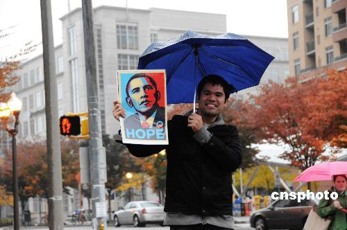 華盛頓街頭一位奧巴馬支持者舉著寫有“希望”字樣的奧巴馬像,號召人們抓緊時間“顆粒歸倉”,把奧巴馬送到白宮。