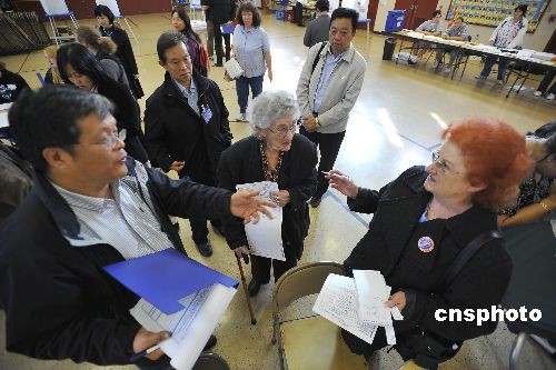 當地時間十一月四日,是美國總統選舉投票日。來自北京的一考察團在加州舊金山灣區十余個投票站考察并體驗投票過程。圖為一位中國學者在和美國選民交流。 中新社發 陳鋼 攝
