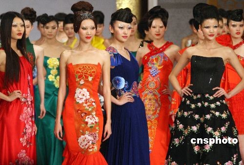 11月5日晚,北京舉行的中國國際時裝周(2009春夏系列發布),上演了一場華服大典。“國色天香 華服大典”以緙絲傳承歷史,以牡丹展現盛世繁華,續寫中國奢侈品文明復興的傳奇。圖為模特展示2009華服大典作品。中新社發 錢興強 攝