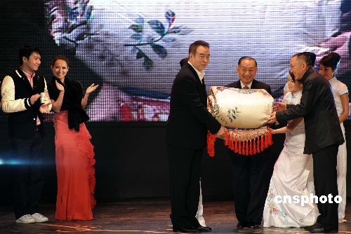 12月2日晚,陳凱歌執導的電影《梅蘭芳》在北京中影懷柔影視基地舉行首映禮,片方陳凱歌、韓三平向梅蘭芳之子歸還其父使用過的“守舊”。梅葆玖曾將“守舊”借給《梅蘭芳》攝制組用于電影拍攝。中新社發 廖攀 攝