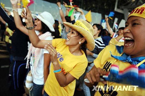 12月3日,泰國反政府的人民民主聯盟(民盟)支持者在曼谷素萬那普國際機場載歌載舞。 當天,民盟結束對總理府和曼谷兩座機場的占領,宣稱推翻頌猜政府的目的已經達到,所有反政府集會全部停止。