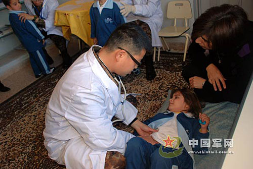 今天體檢的是該校幼兒園的小朋友。上午9點開始,中國維和軍醫(yī)對孩子們的身高、體重、五官、內(nèi)科、外科進行了全面體檢,并將檢查結果詳細記錄,交給該校老師存檔。皮膚科、婦科醫(yī)生則為慕名而來的當?shù)厝罕娺M行了義診。至中午12點,中國醫(yī)護人員共為該校幼兒園的100余名小朋友進行了體檢,治療20余名皮膚、婦科患者。