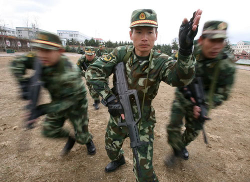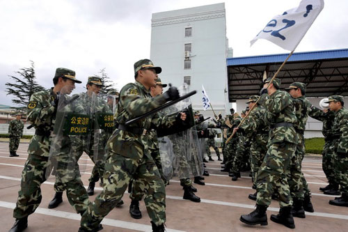 防暴隊員在進行戰(zhàn)術合成課目訓練