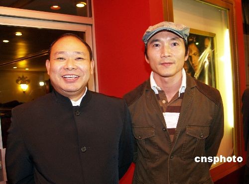 圖為左起張倫導演與好萊塢武打明星鄒兆龍在首映式上。中新社發 盧威 攝