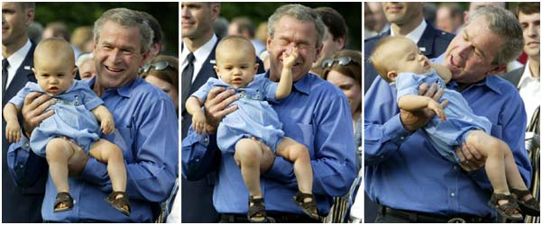 在白宮傳統的一年一度夏季野餐會上,美國總統布什在逗玩國會議員的兒子。
