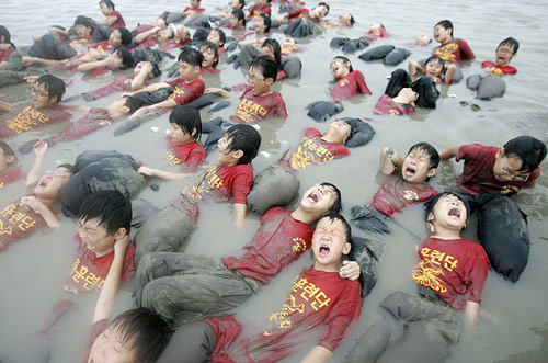 韓國(guó)小學(xué)生在安山 Daebu 的新兵訓(xùn)練營(yíng),很多孩子在喊“媽媽”。