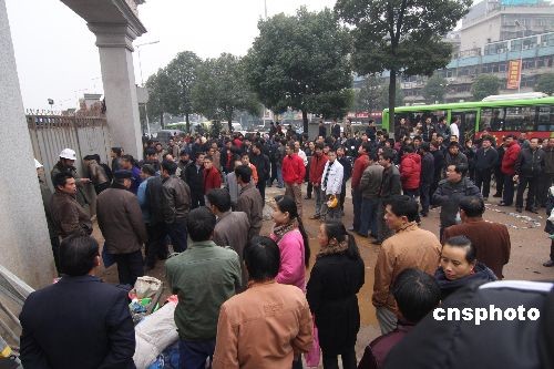 許多人在長沙市井灣子韶山南路634號湖南東方紅建設集團上海城19棟項目部發生建筑施工升降機掛籃墜落事故現場圍觀。中新社發 郭國權 攝