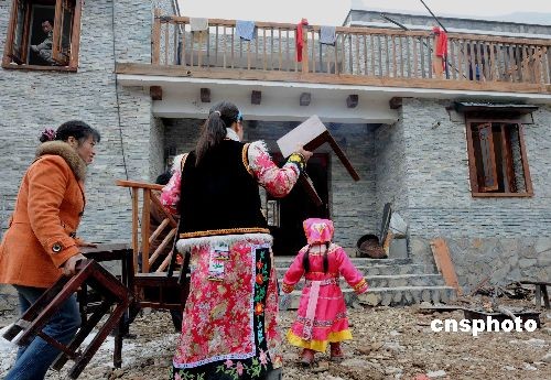 12月31日,四川地震極重災區的北川縣一戶羌族災區民眾,在2008年最后一天搬進貓兒石新建的羌寨農家。中新社發 賈國榮 攝