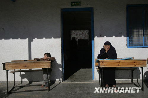 1月3日,在加沙地帶南部拉法,一名巴勒斯坦男孩(左)和家人臨時寄居在一個難民營的學校里。