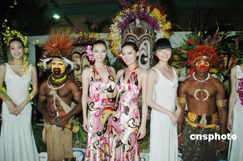 圖為來自巴布亞新幾內(nèi)亞的蘭花參展商在展臺前展示本國獨(dú)特的民族文化,吸引參會模特們合影留念。中新社發(fā) 尹海明 攝