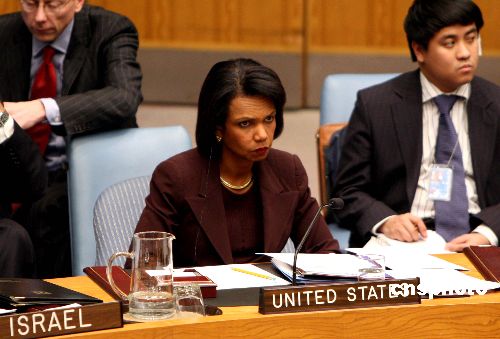 聯合國安理會一月六日晚就加沙局勢舉行緊急會議。美國國務卿賴斯出席會議。中新社發 李靜 攝