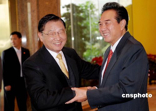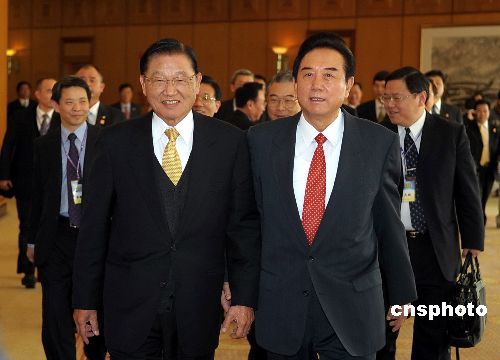 一月七日下午,海峽兩岸關系協(xié)會會長陳云林在深圳五洲賓館,會見臺灣海峽交流基金會董事長江丙坤率領的海基會臺資企業(yè)考察團,兩會就臺企應對金融危機交換意見。中新社發(fā) 陳文 攝