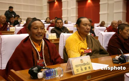 1月12日,西藏自治區政協九屆二次會議在拉薩開幕,宗教界人士滿懷喜悅參加會議并聽取報告。中新社發 賈長飛 攝