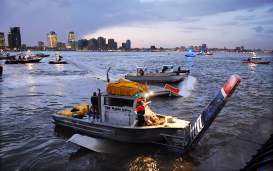 1月15日,在美國紐約的哈德遜河上,救援人員對墜河飛機上的乘客實施營救。