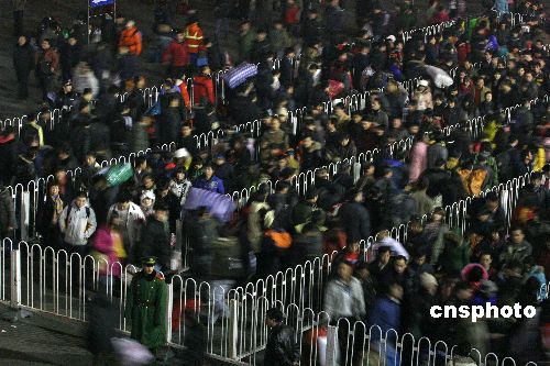 2009年1月19日晚,北京西客站客流大幅攀升,廣大旅客通過S形護欄有序進站。面對今年的春運客流,北京西站充分借鑒奧運場館觀眾分流經驗,提前部署,及早安排,在客流密集的北廣場東西雙向設置了兩處S形護欄,由工作人員在入口處指揮,分流、引導旅客有序進站,確保了春運安全。 中新社發 魯谷 攝
