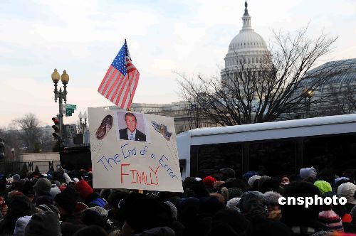 圖為在國家大草地的觀禮民眾打出布什被扔鞋的窘相并寫著:“錯(cuò)誤的最后終結(jié)”!中新社發(fā) 邱江波 攝