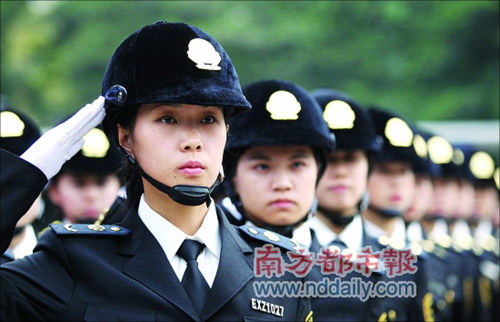 騎士頭盔、靴子、緊身衣,22名女隊員身著新制服集結(jié)宣誓,開電瓶車上路巡街,沿途引起市民驚艷注目。昨日(2009年1月20日)上午,佛山首支城管執(zhí)法女子特勤中隊掛牌上路,佛山欲借此提升打造城管品牌形象。