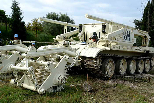 該掃雷車可配有爆破掃雷器、機(jī)械掃雷器和電子掃雷器三種,通過(guò)爆破、打碾、翻排、推壓雷區(qū)土地等方法,提高掃雷速度,降低掃雷成本,減少觸雷傷亡人員。在行軍狀態(tài)下,發(fā)動(dòng)機(jī)功率427千瓦,掛裝掃雷犁公路最大行駛速度47千米/小時(shí)。