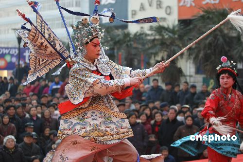 1月26日,安徽淮北市兩宮廣場露天戲臺上,市民們在觀看豫劇表演。當日,正月初一,淮北素有正月唱大戲的習俗。每年正月初一到十五,到處都能看到平地搭建的露天戲臺。中新社發 王璋聞 攝