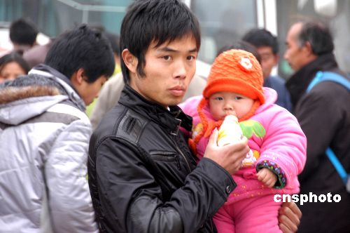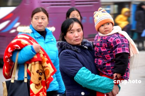 2009年2月1日,在河南新蔡縣汽車站內(nèi),農(nóng)民工們又踏上了外出“淘金”路。春節(jié)剛過,他們就滿懷著夢(mèng)想和憧憬,早早地踏上外出打工的征程,希望牛年能夠給自己帶來好運(yùn)氣。中新社發(fā) 趙學(xué)風(fēng) 攝