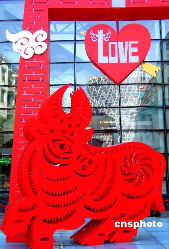 2009年2月12日,情人節前夕,上海新天地為大型牛年圖騰,冠上了“LOVE”字樣,飾以丹心和愛情鳥形象,以此慶祝情人節到來,祈望幸福之家“情愛展翅”、“愛情長!薄V行律绨l 蔣振雄 攝