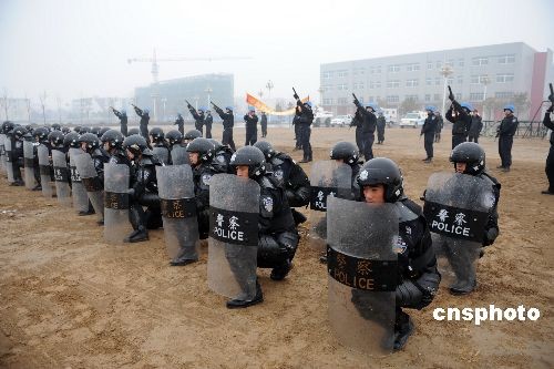 2月12日下午,河北廊坊開始下起小雨,由山東公安邊防總隊組建的中國第八支赴海地維和警察防暴隊在雨中進行處置群體性事件訓(xùn)練。中新社發(fā) 由永懷 攝