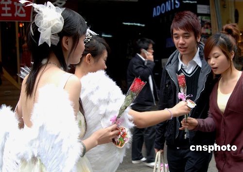 二月十四日情人節(jié),為搶占商機(jī),兩名由商家女服務(wù)生裝扮成的“天使”,在福州市區(qū)街頭向過往的男女青年贈送玫瑰花,成為街頭亮麗一景。中新社發(fā) 劉可耕 攝