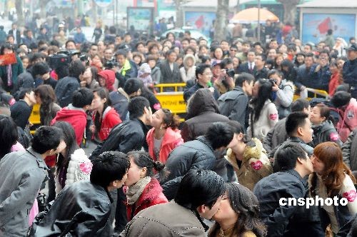 2月14日,杭州市首屆情人節“牛吻”大賽在武林銀泰、西湖銀泰、杭州百貨大樓三地同時舉行,活動吸引了80對情侶前來參加。中新社發 引煒 攝