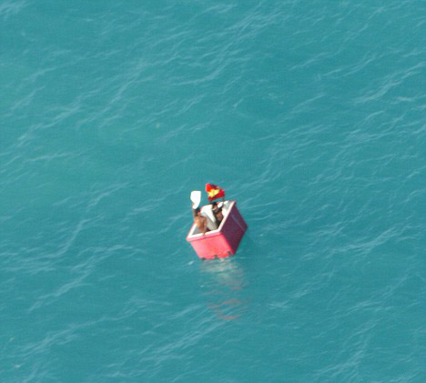 08年12月23日,兩個(gè)緬甸漁民的漁船在澳洲北部海岸外翻覆,船上20人落海。他們兩人擠進(jìn)面積只有一張小桌子大的冰桶里,在鯊魚(yú)出沒(méi)的海上漂流了25天,才被澳洲海岸巡防隊(duì)的飛機(jī)發(fā)現(xiàn)。