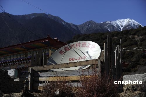 2009年初春,西藏林芝米林縣農村的廣播電視“村村通”工程衛星天線。西藏自治區廣播電視“村村通”工程2000年啟動以來,行政村至少可接收兩套以上電視節目和一套以上廣播節目,規模較大的行政村可收看4套以上電視節目。農牧民聚居密度大的地方,還安裝了農村小片網有線電視,可收看6套以上的電視節目。中新社發 廖攀 攝
