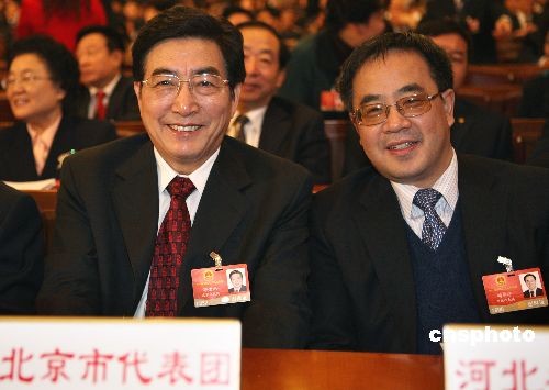 3月5日上午,十一屆全國人大二次會議在北京人民大會堂開幕,先后在西藏工作過的的北京市市長郭金龍(左)、河北省省長胡春華出席大會時比鄰而坐。中新社發 任晨鳴 攝