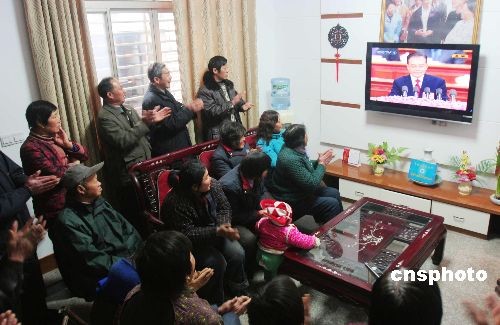 3月5日,江蘇省海安縣海安鎮園莊村的村民們聚集在一起收看“兩會”現場直播。當日,十一屆全國人大二次會議在北京人民大會堂召開,村民們覺得溫家寶總理在大會上所作的政府工作報告中提出的一系列惠農政策深得人心。中新社發 周皖芹 攝