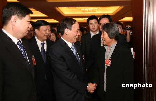 3月5日下午,山東代表團舉行全團會,審議政府工作報告。中共中央政治局委員、國務院副總理王岐山,全國人大常委會副委員長華建敏和代表們一起審議政府工作報告。中新社發 王輝 攝