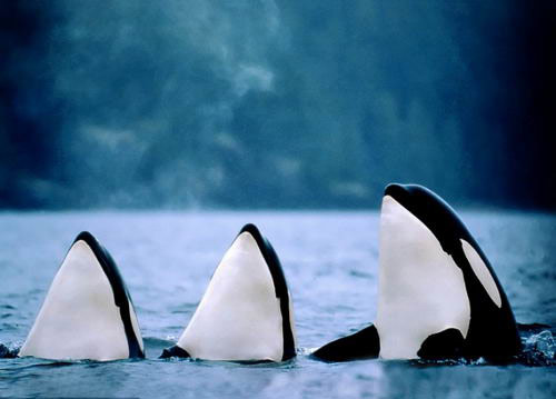 殺人鯨水中群舞。攝影師奧爾夫-?嗽诩幽么鬁馗缛A附近海域拍下了三頭野生殺人鯨(學名為虎鯨)在水中群舞的照片。