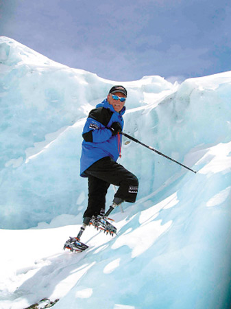“無(wú)腿人”征服世界最高峰。47歲的新西蘭人馬克·英格利斯于2006年曾成功登頂珠穆朗瑪峰,成為世界上第一位登上世界最高峰的雙腿殘疾者。英格利斯是一個(gè)傳奇人物。1982年,在攀登新西蘭最高峰庫(kù)克峰時(shí),他的雙腿被凍壞。截肢后的英格利斯改練自行車(chē),并獲得殘奧會(huì)銀牌。但是,他從未放棄登山夢(mèng)想,終于在2006年5月15日夢(mèng)想成真。用英格利斯妻子的話說(shuō),“登頂那一刻,他摸到了天”。