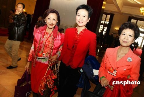 3月8日,全國政協十一屆二次會議舉行第三次全體會議。圖為李小琳(中)、鄭明明(左)等女委員著鮮艷服裝參加會議。中新社發 傅丹丹 攝