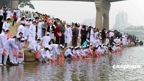 三月八日,為慶祝三八國際勞動婦女節,廣西南國早報網組織南寧市女性在南寧母親河——邕江放生百萬尾魚苗。中新社發 蔣雪林 攝