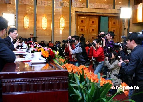 在全國政協(xié)十一屆二次會議3月8日就2010年5月上海舉辦世界博覽會舉行記者會,萬季飛、周漢民、成岳沖、楊瀾等四位全國政協(xié)委員回答記者提問。他們回答了籌備中的上海世界博覽會資金來源,籌備進(jìn)度情況,外界關(guān)注的美國、臺灣參展情況,金融危機(jī)的影響及民營企業(yè)參展情況等問題。與會中外記者表現(xiàn)出極大關(guān)注,爭相提問。中新社發(fā) 宋吉河 攝