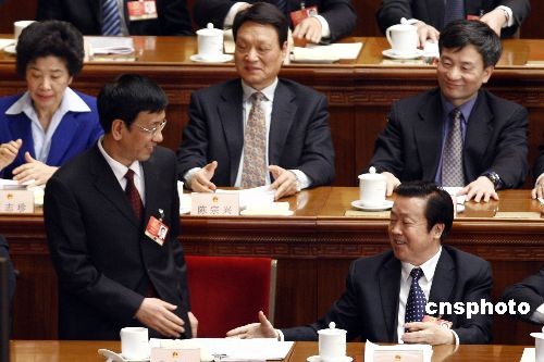 3月10日,十一屆全國人大二次會議在北京人民大會堂舉行第三次全體會議,最高人民法院院長王勝俊、最高人民檢察院檢察長曹建明分別作工作報告。圖為曹建明作完報告回到座位后與王勝俊握手。中新社發 盛佳鵬 攝