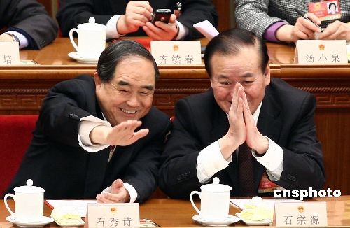 3月13日,十一屆全國人大第二次會議在人民大會堂舉行閉幕會,全國人大財政經濟委員會主任委員石秀詩、貴州省委書記石宗源在主席臺上和主席臺下的代表打招呼。中新社發 杜洋 攝