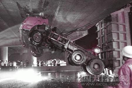 14日晚10時許,四川樂山市郊辜李壩立交橋下發生離奇一幕:一輛雙橋翻斗貨車從橋下穿過時,車斗突然翻起,將貨車卡在橋下。事故導致貨車上兩人一死一傷,出事路段交通受阻。昨日凌晨2時許,出事車輛被“取出”并拖離現場。