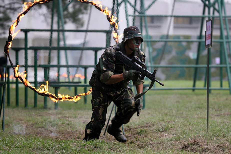 本網記者近日在中國人民解放軍駐香港部隊石崗營區訓練場,觀看了駐港部隊偵察兵實彈突擊演練。身穿迷彩服、面涂油彩的戰士們冒著“槍林彈雨”,背負槍械攻克障礙,其間穿越火障、跨越滑橋、潛灘暗渡,更肩扛一百公斤的圓木進行二百米極限沖刺。這些障礙項目是對戰士意志、體力與心理的多重磨練,連續通過二十一個項目,更是挑戰體能的極限。鄭祚聲 攝