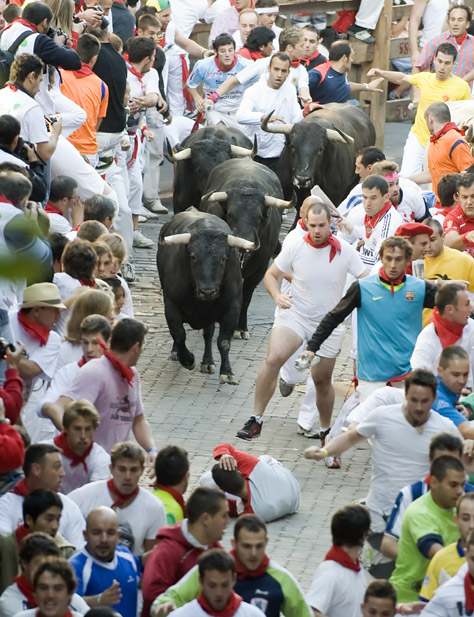 7月8日,在西班牙潘普洛納,參加奔牛節活動的人們躲避猛沖的公牛。