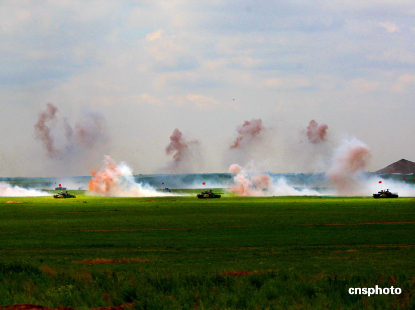 中國、俄羅斯兩軍總參謀長,7月23日上午到沈陽軍區洮南合同戰術訓練基地,觀看“和平使命2009”聯合反恐軍事演習。雙方以陸軍和空軍為主,中方參演部隊包括1個陸軍戰斗群和1個空軍戰斗群。俄方參演兵力包括1個陸軍加強摩步營、1個空降突擊連和部分空軍兵力,雙方投入兵力兩千多人。中新社發 宋吉河 攝